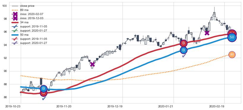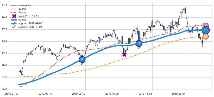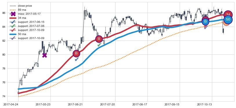 上涨趋势2017-04-24-2017-10-24,均线34, 50确认关键支撑3处