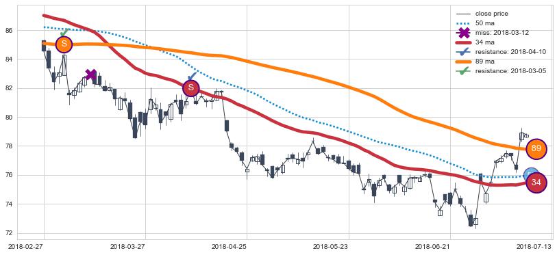 下跌趋势2018-02-27-2018-07-13,均线89, 34确认关键阻力2处