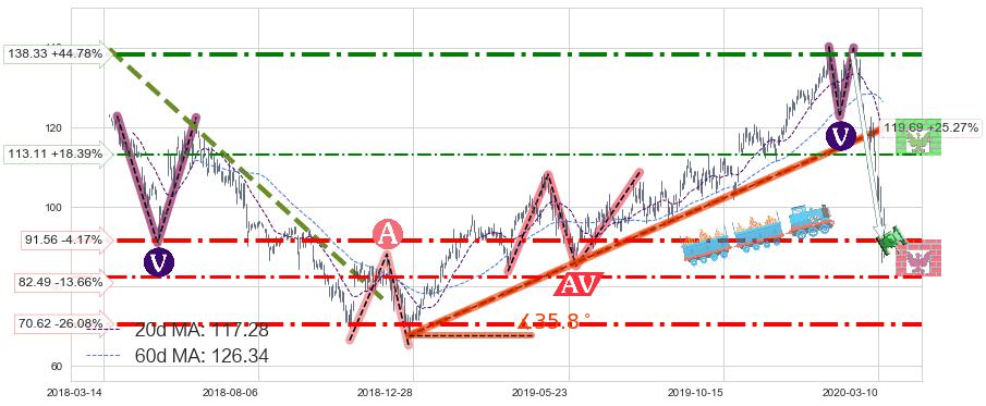 ♘ 阻力价格位113.11,可信任强度41.60%,距离最后交易2020-03-13形成的收盘价格95.54相差 +18.39%