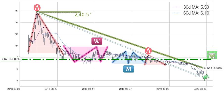从2018-06-01至2020-03-12,共包含448个交易日,阶段股价下跌-88.87%,阶段股价变动位移路程比: 1 : 10,下跌趋势角度: 40.5