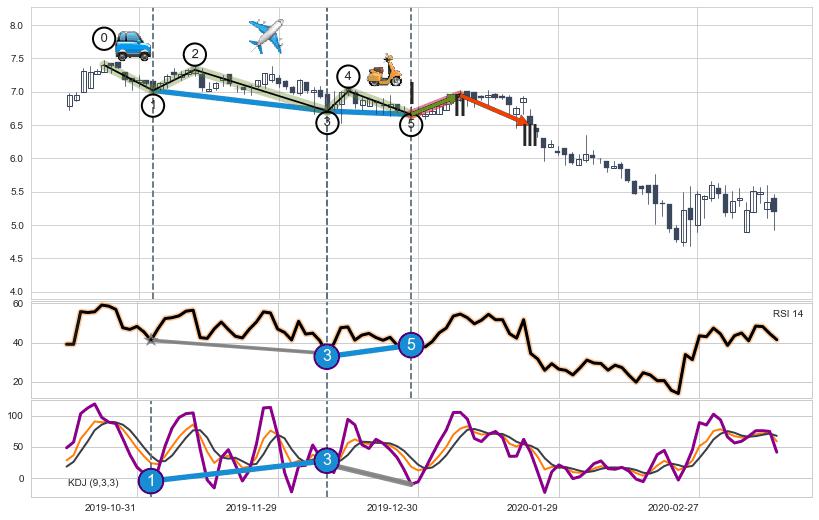 ➣ 第一, 三驱动浪端点:【KDJ】走势出现【常规背离 & 反转信号】背离程度99.00%,背离夹角角度52.2˚,背离程度较大