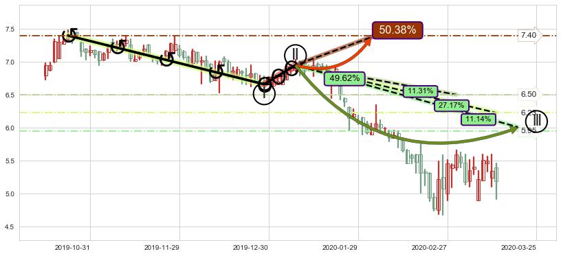 ➢ 循环浪继续向下【最高】位置(2020-03-02, 6.50),匹配聚类样本比例22.80%, 可能性概率11.31%