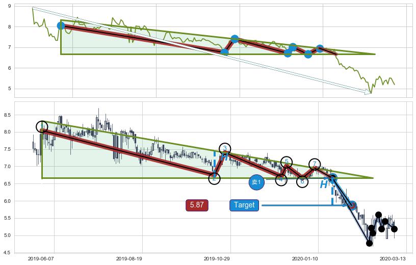 ➢ 【多方力量耗尽,空方打破攻守平衡点】下降三角形中继整理, 已在2020-01-23突破【支撑】颈线 6.66 →演变成下降通道