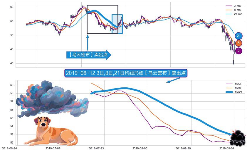⚀ 2019-07-18日-2019-09-04日显现 3日-8日-21日均线 【乌云密布】卖出点 看空信号,后市看跌,卖出