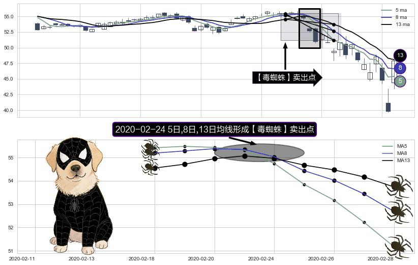 ⚀ 2020-02-24日显现 5日-8日-13日均线 【毒蜘蛛】卖出点 看空信号,后市看跌,卖出