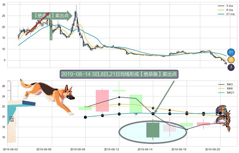 ⚀ 2019-08-14日显现 3日-8日-21日均线 【绝命跳】卖出点 看空信号,后市看跌,卖出