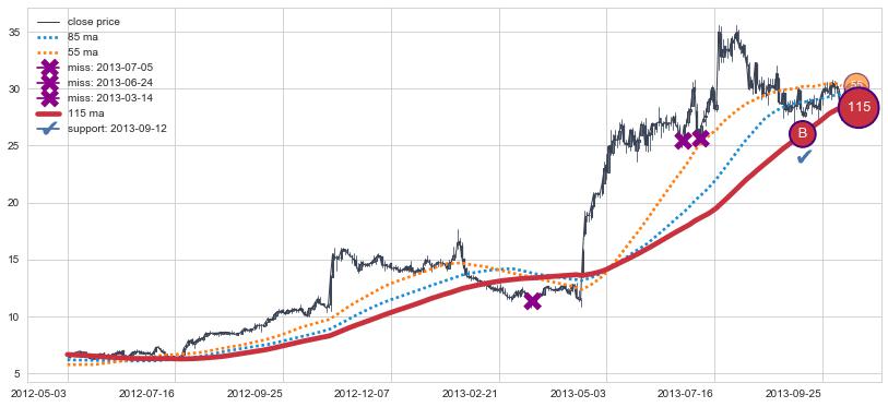 2013-10-08至2017-07-18 慢线与快线多次接触,存在上下穿越,有缠绕