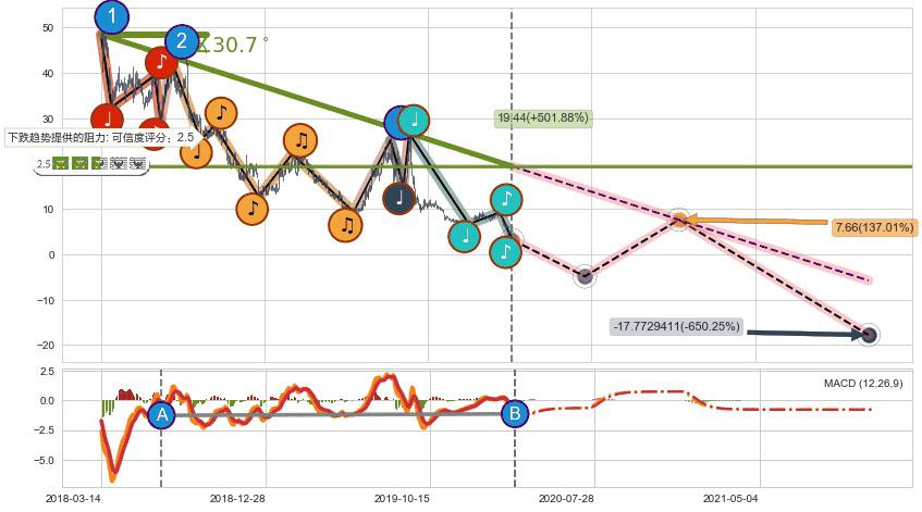 从2018-03-14至2020-03-13,共包含504个交易日,阶段股价下跌-180.25%,阶段股价变动位移路程比: 1 : 11,下跌趋势角度: 30.7