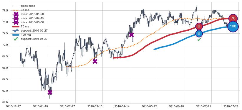 上涨趋势2015-12-17-2016-07-28,均线100, 70确认关键支撑1处