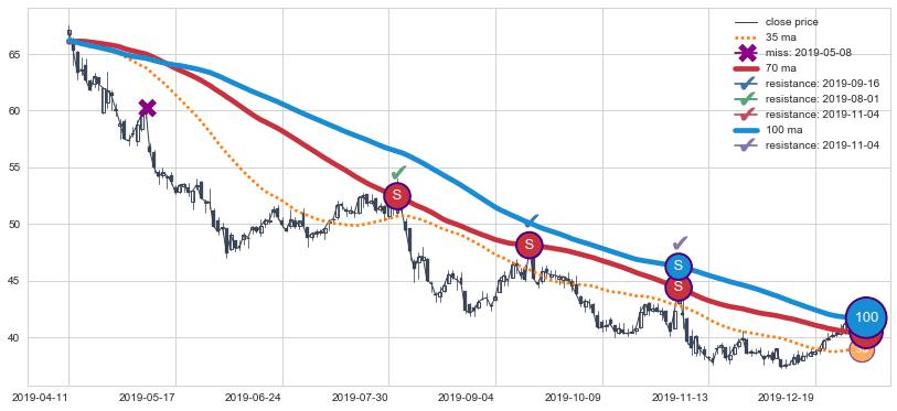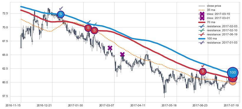 下跌趋势2016-11-15-2017-07-19,均线100, 70确认关键阻力4处
