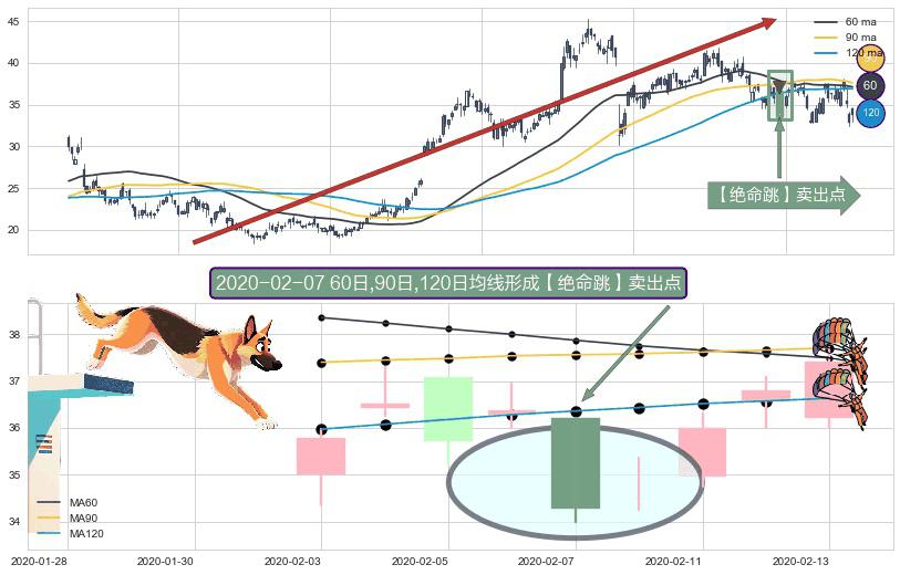 形态多维评估: ⚀ 2020-02-07日显现 60日-90日-120日均线 【绝命跳】卖出点 看空信号,后市看跌,卖出