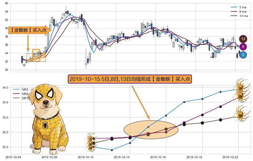 形态多维评估: ⚀ 2019-10-15日显现 5日-8日-13日均线 【金蜘蛛】买入点 看多信号,后市看涨,买入