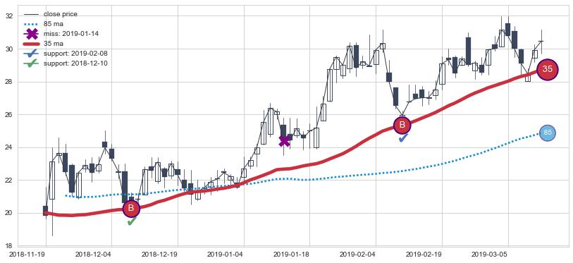 上涨趋势2018-11-19-2019-03-12,均线35确认关键支撑2处