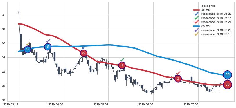 下跌趋势2019-03-12-2019-07-22,均线35, 85确认关键阻力5处
