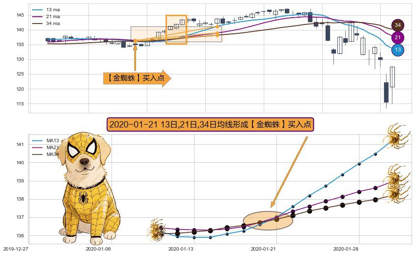 ⚀ 2020-01-21日显现 13日-21日-34日均线 【金蜘蛛】买入点 看多信号,后市看涨,买入