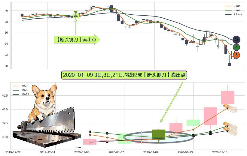 ⚀ 2020-01-09日显现 3日-8日-21日均线 【断头铡刀】卖出点 看空信号,后市看跌,卖出