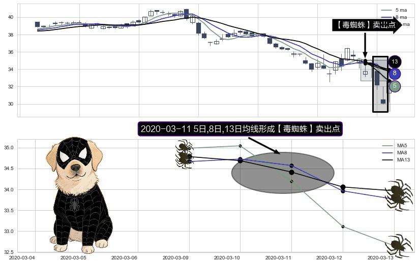 ⚀ 2020-03-11日显现 5日-8日-13日均线 【毒蜘蛛】卖出点 看空信号,后市看跌,卖出