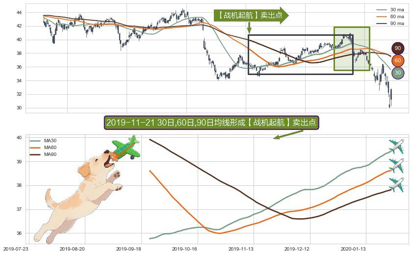 ⚀ 2019-09-23日-2020-01-27日显现 30日-60日-90日均线 【战机起航】卖出点 看空信号,后市看跌,卖出