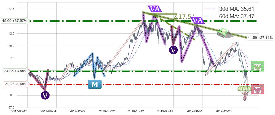 ♘ 阻力价格位45.00,可信任强度90.05%,距离最后交易2020-03-13形成的收盘价格32.71相差 +37.57%