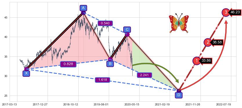 ➣ 未完成【蝴蝶】形态起点X: 2017-06-08, 已到达C点: 2020-01-23, 预测最终D点: 2021-05-12, 共998交易日