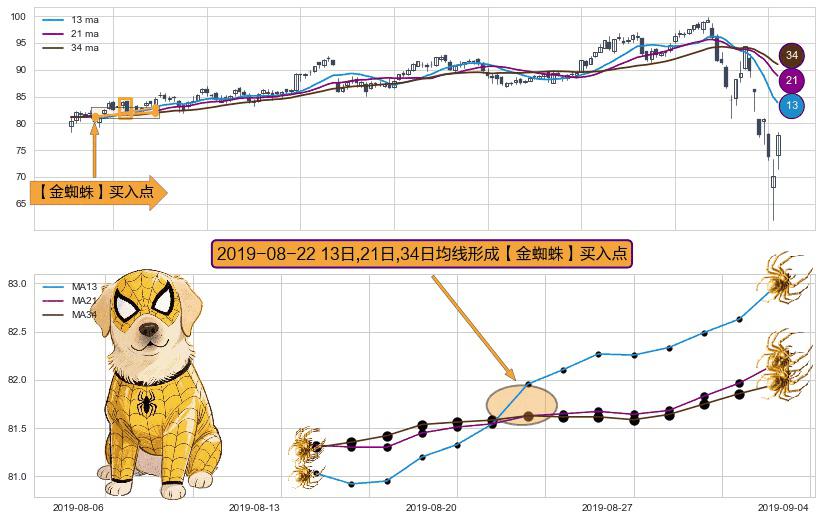 ⚀ 2019-08-22日显现 13日-21日-34日均线 【金蜘蛛】买入点 看多信号,后市看涨,买入