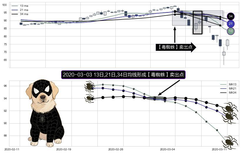 ⚀ 2020-03-03日显现 13日-21日-34日均线 【毒蜘蛛】卖出点 看空信号,后市看跌,卖出