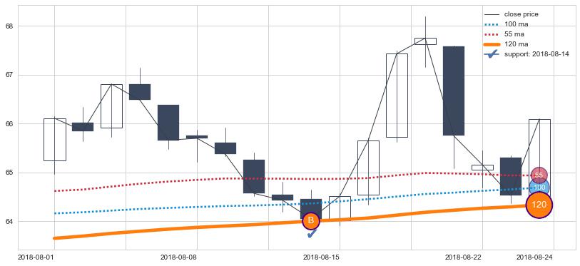 ⚂ 2019-08-08日突然冒出一根大阳线,一下子顶穿三条均线且收盘价收在各条均线之上