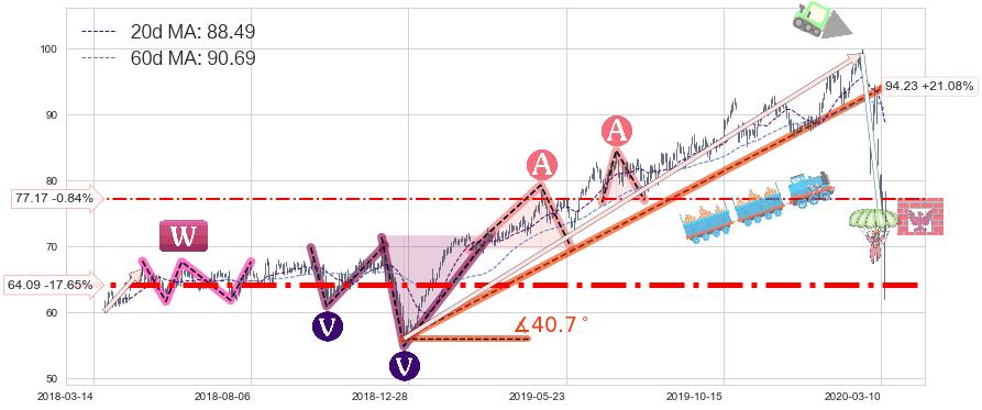 ♘ 支撑价格位64.09,可信任强度99.00%,距离最后交易2020-03-13形成的收盘价格77.82相差 -17.65%