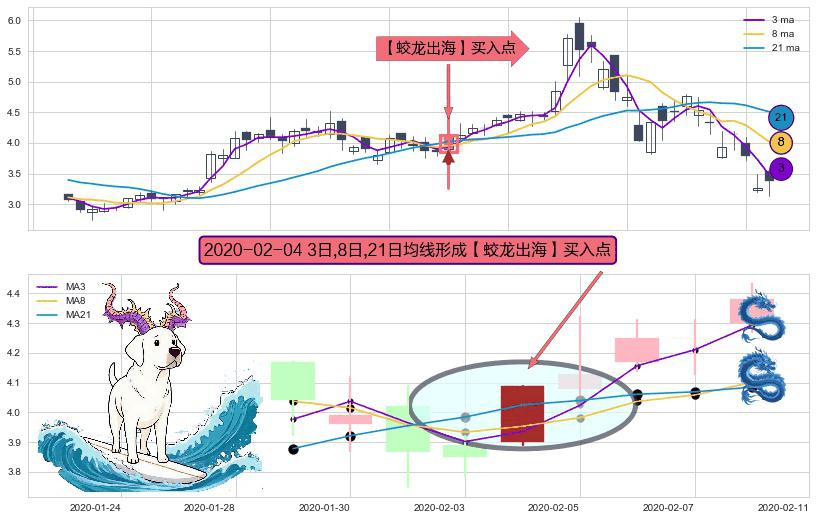 ⚀ 2020-02-04日显现 3日-8日-21日均线 【蛟龙出海】买入点 看多信号,后市看涨,买入