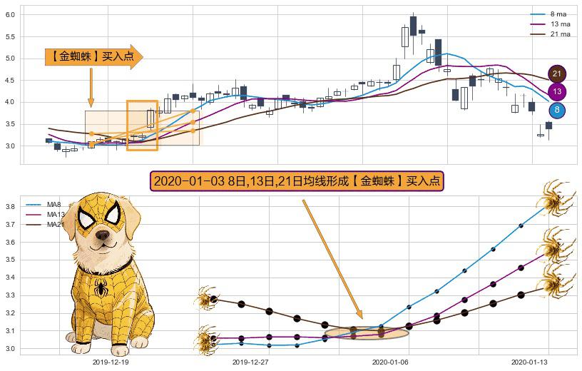 ⚀ 2020-01-03日显现 8日-13日-21日均线 【金蜘蛛】买入点 看多信号,后市看涨,买入