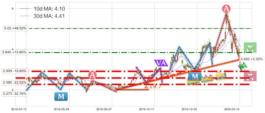 ♘ 阻力价格位3.840,可信任强度67.63%,距离最后交易2020-03-13形成的收盘价格3.380相差 +13.60%