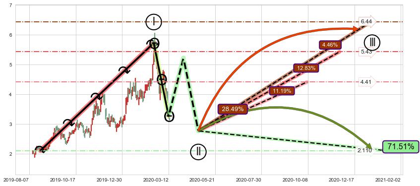 ➢ 循环浪继续向上【最低】位置(2020-10-07, 4.41),匹配聚类样本比例39.29%, 可能性概率11.19%