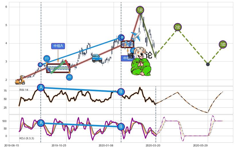 ➣ 【中枢B】:2020-01-23-2020-02-04,中枢由5笔构成,共9交易日, ZG=3.930, ZD=3.850