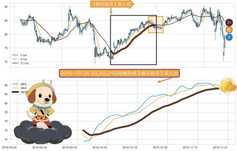 形态多维评估: ⚀ 2019-09-20日-2019-11-26日显现 3日-8日-21日均线 【烘云托月】买入点 看多信号,后市看涨,买入