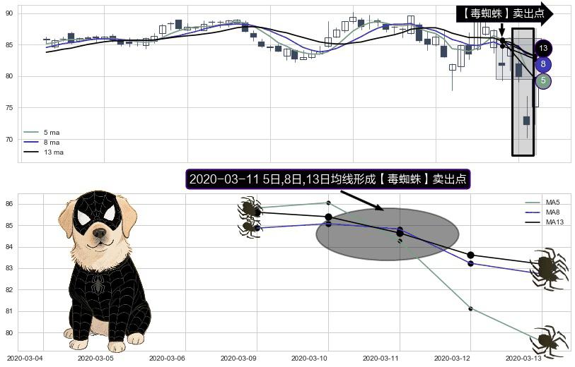 形态多维评估: ⚀ 2020-03-11日显现 5日-8日-13日均线 【毒蜘蛛】卖出点 看空信号,后市看跌,卖出