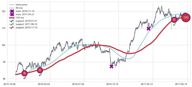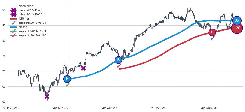 上涨趋势2011-08-23-2012-07-02,均线120, 65确认关键支撑3处