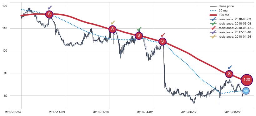 下跌趋势2017-08-24-2018-08-24,均线120确认关键阻力5处