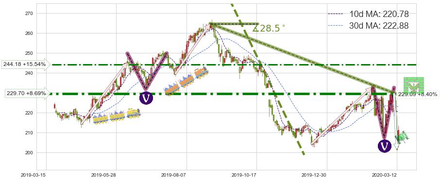 ♘ 阻力价格位229.70,可信任强度90.24%,距离最后交易2020-03-13形成的收盘价格211.34相差 +8.69%