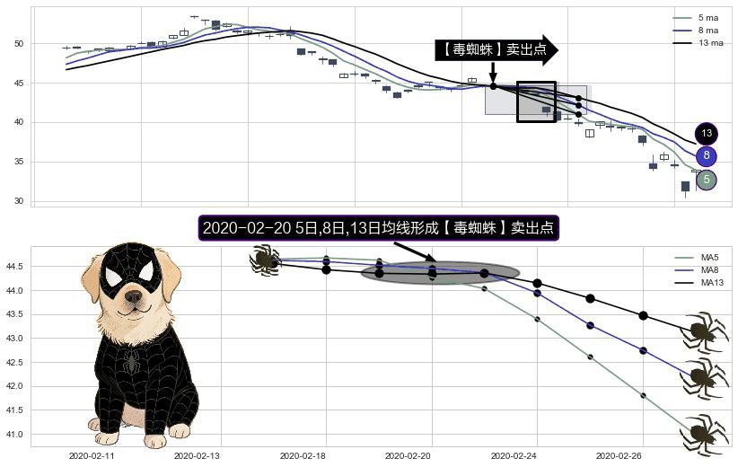 形态多维评估: ⚀ 2020-02-20日显现 5日-8日-13日均线 【毒蜘蛛】卖出点 看空信号,后市看跌,卖出