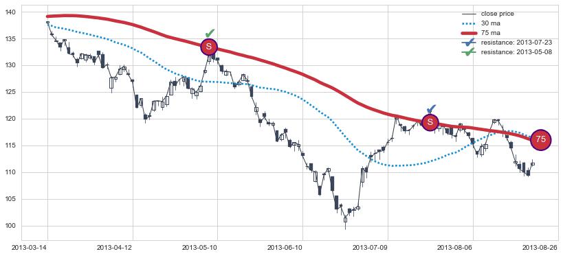 下跌趋势2013-03-14-2013-08-26,均线75确认关键阻力2处