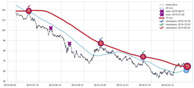 下跌趋势2015-06-04-2016-03-01,均线75确认关键阻力3处