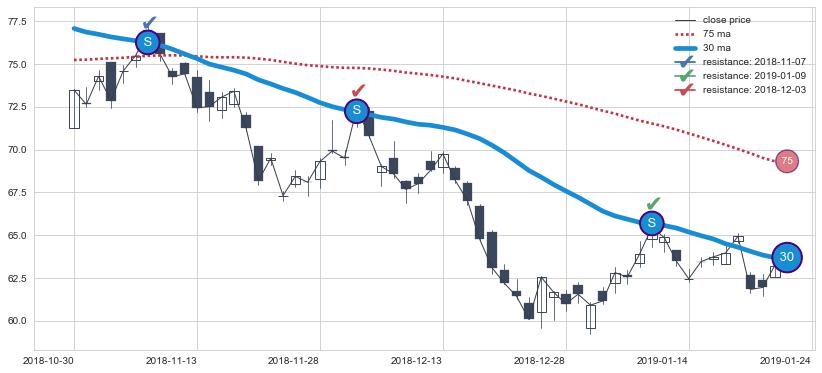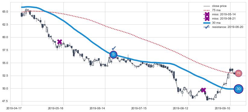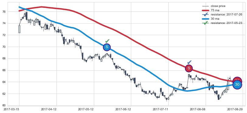 下跌趋势2017-03-15-2017-08-29,均线75, 30确认关键阻力2处