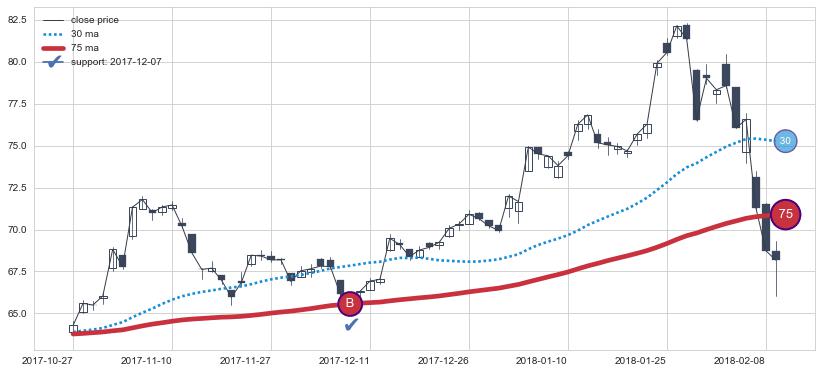 上涨趋势2017-10-27-2018-02-09,均线75确认关键支撑1处