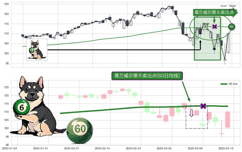 形态多维评估: ⚀ 2020-03-05-日显现 葛兰威尔均线 60日均线 第⑥卖出点 走势反转见顶信号,后市看跌,卖出信号