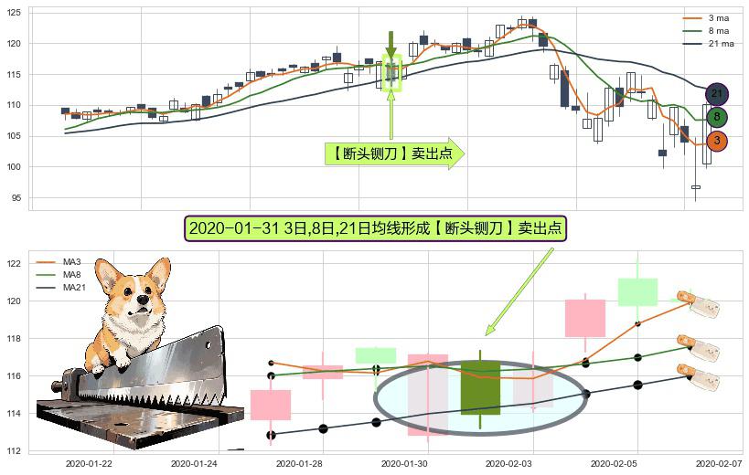 形态多维评估: ⚀ 2020-01-31日显现 3日-8日-21日均线 【断头铡刀】卖出点 看空信号,后市看跌,卖出