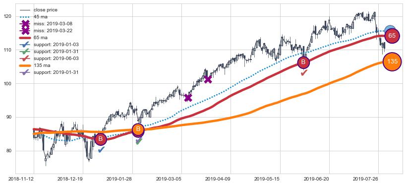 上涨趋势2018-11-12-2019-07-31,均线65, 135确认关键支撑3处
