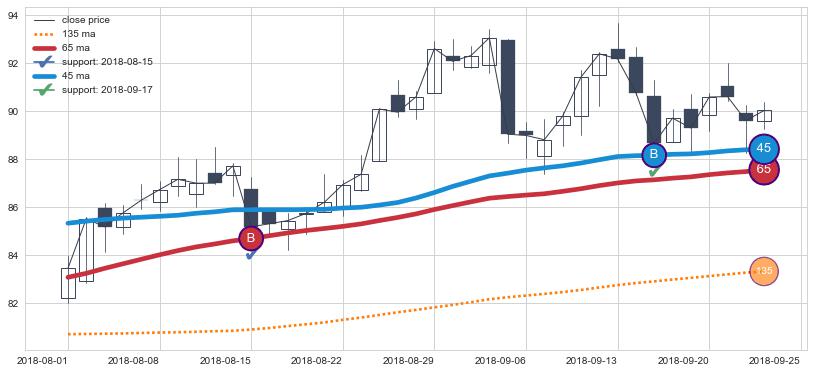 上涨趋势2018-08-01-2018-09-25,均线65, 45确认关键支撑2处