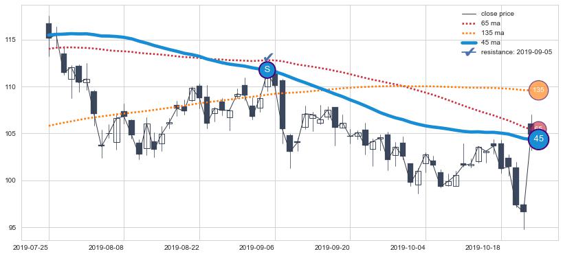下跌趋势2019-07-25-2019-10-24,均线45确认关键阻力1处