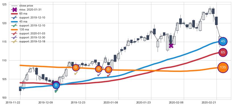 上涨趋势2019-11-22-2020-02-24,均线65, 45, 135确认关键支撑4处