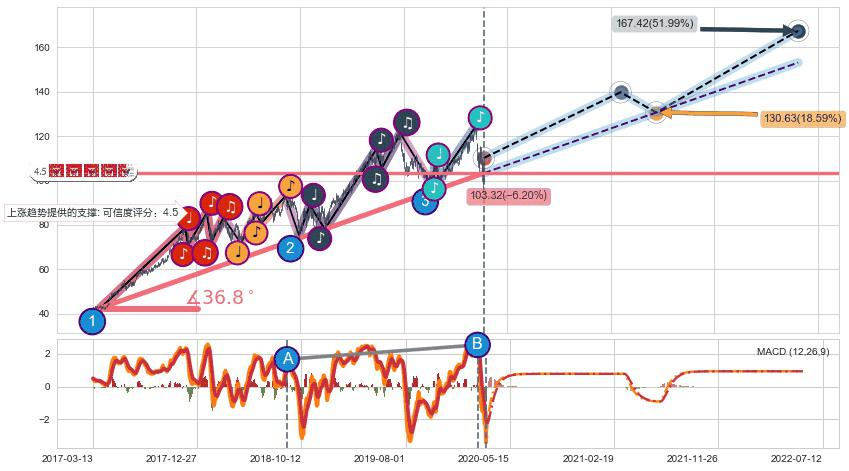 ♘ 在最后的上升阶段2017-03-14至2020-03-11存在 持续未破位的支撑位 ,支撑价格103.32,支撑可信任强度88.34%,其距离最后价格110.15相差 -6.20%